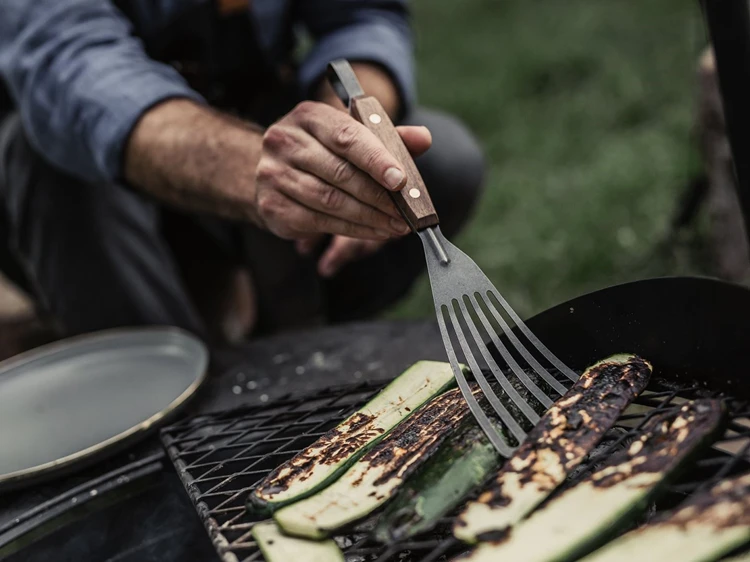 Cowboy Cooking accessoires. Ontworpen om samen met u Cowboy Fire Pit Grill Systeem te gebruiken. Makkelijk op te hangen aan de accessoire organizer stang. Ontworpen met directe inbreng van de Barebones open fire chef partners. Met de hand gesmeed en bewerkt. Roestvast staal met zwarte afwerking.Koperen accenten. Walnotenhouten handgrepen.Extra lang om veilig te genieten.