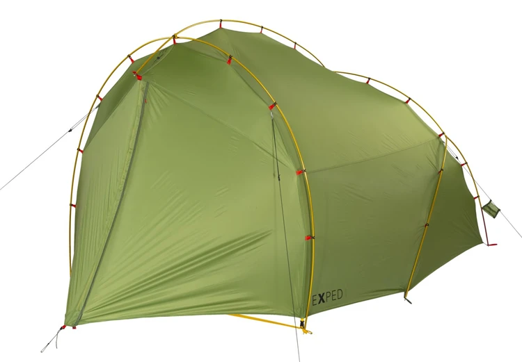 De Outer Space van Exped is een zeer slim ontworpen tent met een ruime voortent. De voortent is hoog en ruim genoeg om twee lichtgewicht kampeerstoeltjes te kunnen gebruiken. De voortent kan helemaal weg worden gerold. Zo kan je uit de wind zitten en heb je toch ruim uitzicht.Naast de ruime voortent, heeft de tent nog een extra uitgang aan de achterzijde. Ideaal omdat de binnentent een zogenaamde ‘dwarsslaper’ is. Dankzij de tweede uitgang hoef je ’s nachts niet over elkaar heen te kruipen als je er even uit moet.OpzetgemakDe tent is zeer snel op te zetten doordat de stokken aan de buitenzijde met clips aan het buitendak worden bevestigd. De binnentent zit direct aan de buitentent vast, deze staat gelijk. Mocht de tent bij nat weer worden ingepakt dan kun je eerste de binnentent eruit halen en deze alvast droog inpakken, voordat je de buitentent afbreekt.De binnentent is aan de bovenzijde voorzien van mesh voor gewichtsbesparing en ventilatie. Aan beide hoofdeinden zijn zakjes van mesh om bijvoorbeeld je hoofdlamp op te bergen. Voor extra ventilatie zijn de ritsen in het buitendak met dubbelle lopers uitgevoerd. Door de bovenste loper iets naar beneden te trekken en deze open te zetten met het foam versterkte uithoudertje, creeër je extra doorstroming.Een zeer doordachte tent, ideaal voor de fietskampeerder.