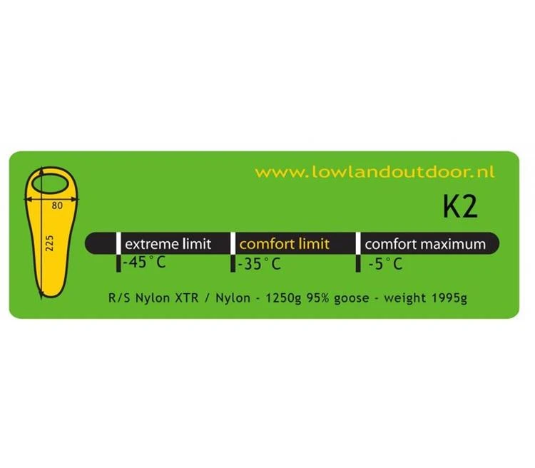 Voor de relatief kleine groep mensen die de hoogste toppen van deze aardbol verkennen, sneeuw en wind trotserend, is er LOWLAND OUTDOOR® K2 slaapzak. Met meer dan een kilo ganzendons om je heen en donsbanen van 8 cm dik, trotseer je de onvoorstelbare kou tot -35°C. In alle opzichten de meest extreme slaapzak. Respect voor de koper. We ontvangen graag een stoere foto van je bij de vlag op de top of de pool