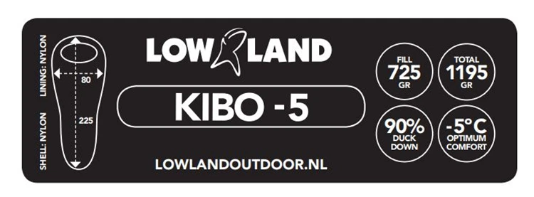 De KIBO -5 mummie slaapzak is de warmste slaapzak binnen de Lowland Outdoor KIBO serie. Met een comfort temperatuur van -5 graden is hij geschikt voor kampeerders en backpackers die het hele jaar op pad gaan en overnachten bij een buitentemperatuur tot -5 graden. Om een comfortabele nacht te garanderen onder koude omstandigheden is de KIBO -5 gevuld met 725 gram 90% eendendons van 600 Cuin. Het dons dat Lowland Outdoor voor de gehele KIBO-serie gebruikt is RDS- gecertificeerd. Dons geeft de meeste warmte bij een laag gewicht. Daarnaast gaat dons erg lang mee en daarmee is dons dus ook hierdoor een duurzame keuze. De KIBO -5 is aan de binnen- en buitenzijde gemaakt van rip-stop nylon. De binnenzijde voelt heerlijk zacht aan en slaapt daardoor comfortabel. Een goed gevulde tochtkraag zorgt ervoor dat de KIBO -5 hier geen warme verliest. De voeten krijgen bij de KIBO -5 voldoende ruimte door een speciaal vergrote footbox. De slaapzak heeft een stevige 2-richting YKK-ritsluiting met een anti-snag slider. De anti-snag slider voorkomt dat er stof tussen de rits komt en je de rits dus altijd makkelijk kan openen; zo kan je altijd op gevoel in het donker zonder de paniek van een geblokkeerde rits een gang naar het toilet maken. En omdat het een tweeweg rits is, kan je de slaapzak ook bij de voeten openen voor wat verkoeling of extra bewegingsvrijheid. Aan de binnenzijde van de KIBO -5 zit ter hoogte van de schouder een opbergzak voor waardevolle eigendommen en oordopjes.