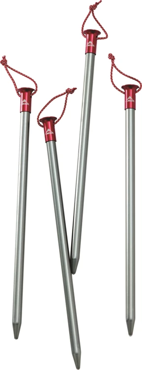 The rugged and simple Core Stake was engineered as a lightweight anchor for use in hard ground. Constructed of ultralight 7075 aluminum, it offers high strength and holding power, with the added durability of a solid aluminum head. A reflective pull loop allows for easy removal. Available in 15 cm and 23 cm lengths. Sold individually and as a kit of 4 stakes.