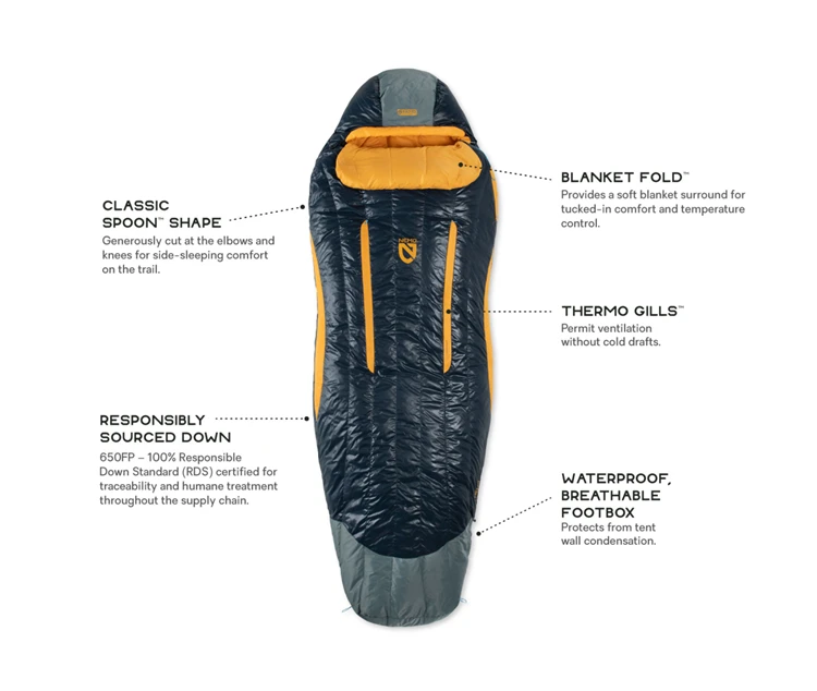 Disco blijft regeren als de ideale donzen rugzak voor zijslapers en biedt het hoogst mogelijke comfort op de tocht. Zeventig procent van alle mensen slaapt op hun zij, daarom heeft NEMO de iconische Spoon™ Shape tas ontworpen om de balans tussen comfort en draagbaarheid te verfijnen. De Classic Spoon™ vorm is de sweet spot van de serie, met een ruime snit bij de ellebogen en knieën zodat slapers gedurende de nacht comfortabel van positie kunnen veranderen. (Zelfs met het ruimere silhouet is deze tas opmerkelijk klein op te vouwen.) Premium 650 FP hydrofoob, RDS-gecertificeerd dons zorgt voor traceerbaarheid in de hele toeleveringsketen en biedt superieure warmte voor koude nachten. Deze 3-seizoenen rugzak zit vol met functies, waaronder Thermo Gill™ ventilatieopeningen die de temperatuur ’s nachts helpen reguleren, een Blanket Fold™ tochtkraag die zorgt voor ingestopt comfort, en een waterdichte/ademende voetenzak die bestand is tegen tentcondensatie. Met de ritsen aan de linkerkant bij de heren en aan de rechterkant bij de dames kunnen twee Discos aan elkaar geritst worden voor een dubbele versie van deze favoriete slaapzakken.