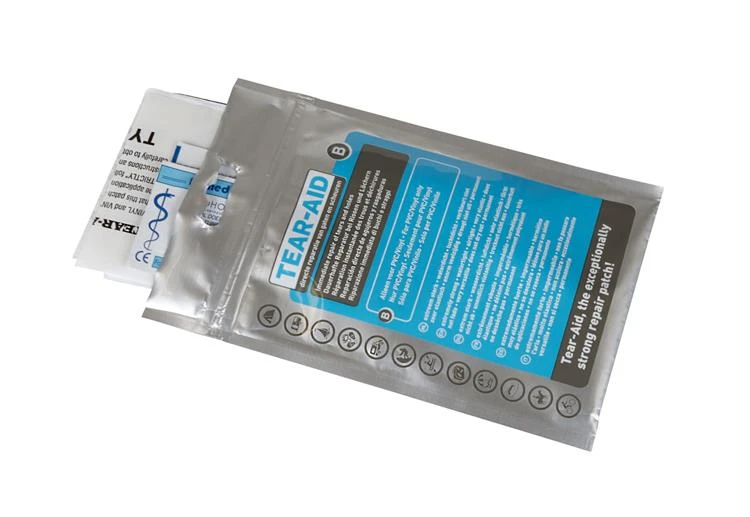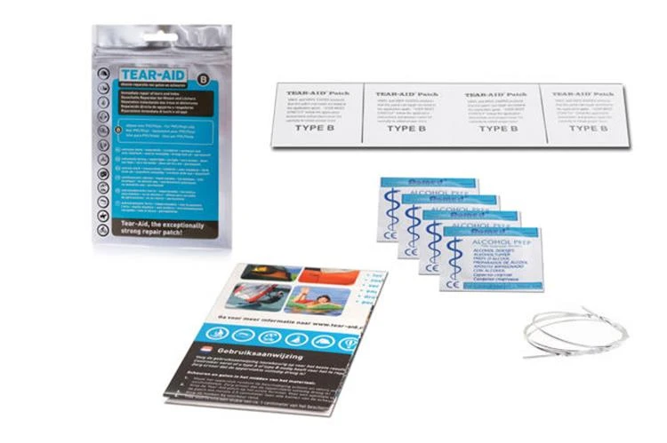 Een multifunctioneel en transparant reparatiemiddel. Tear-Aid B repareert permanent gaten en scheuren in PVC en vinyl. Dit reparatiemiddel is extreem sterk, water- en luchtdicht, zeer elastisch, verkleurt niet en droogt niet uit. Kan zelfs onder water worden gebruikt! Ideaal voor permanente reparatie van PVC tentramen, PVC grondzeilen, (opblaas-) boten, zwembaden, zwembanden, opblaasbaar speelgoed, PVC zonneschermen- en parasols, vinyl regenjassen en tassen. De reparatieset bevat een strook Tear-Aid reparatietape (30x8cm), een verstevigingsdraad (45cm) voor reparatie van scheuren aan randen en vier alcoholdoekjes voor het reinigen van de ondergrond.