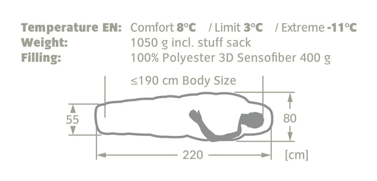 Warmth whenever and wherever you need it! This breathable and easy-care 2-season synthetic fill mummy sleeping bag is also environmentally sustainable, made with bluesign® certified materials. The Sensofiber micro-fiber fill reflects body heat yet efficiently transfers moisture away from the body and so maintains a wonderfully comfortable sleeping climate. As all synthetic fibers, Sensofiber warms even when damp, is quick drying, easy to maintain and long-lasting. The Sioux 400 is a solidly reliable, warm outdoor sleeping bag for trekking and cabin tours in moderate climate zones.